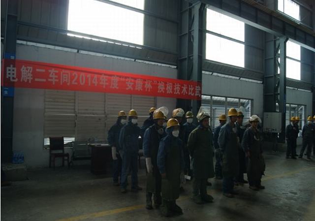 青海物產(chǎn)工業(yè)投資有限公司全面啟動(dòng)"安康杯"競(jìng)賽活動(dòng)。2014年4月15日上午電解二車間舉行了"安康杯"換極技術(shù)比武大賽。公司副總經(jīng)理張?jiān)手?,副總?jīng)理、工會(huì)主席張秉瑜,總經(jīng)理助理秦建峰出席了開(kāi)幕式。