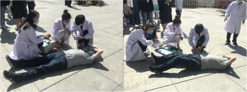 在模擬火災(zāi)救援現(xiàn)場中發(fā)現(xiàn)被困人員,由應(yīng)急救援隊將被困人員從火場中救出并帶至安全區(qū),由醫(yī)療救護(hù)組對傷員進(jìn)行救治及轉(zhuǎn)移。