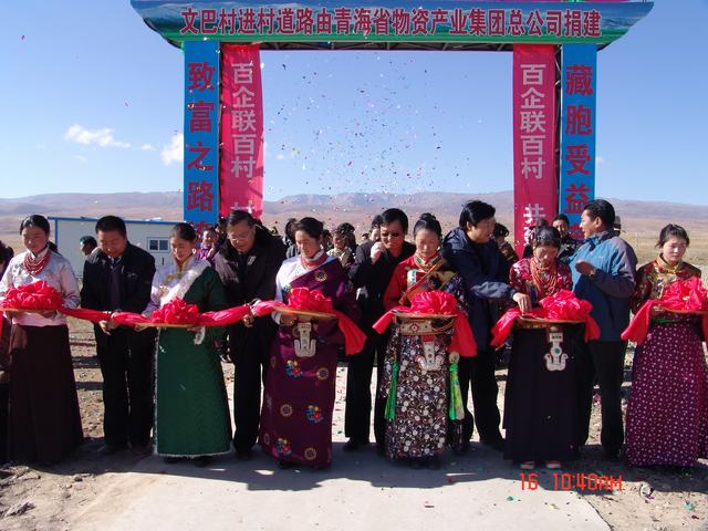 交接儀式上,集團公司總經理王玉輝、共和縣人大常委會主任尕瑪才讓為元者村黨員活動室、科普文化室、醫(yī)療衛(wèi)生室揭牌之后,與黨委書記白家林、紀委書記王仁芬、共和縣委常委、組織部長官卻南見等領導為共和縣黑馬河鄉(xiāng)文巴村進村道路通車剪彩。集團公司黨委書記白家林代表省物產集團向共和縣江西溝鄉(xiāng)提前捐送元者村游牧民定居點工程配套資金100,000元。集團公司紀委書記王仁芬、共和縣委常委、組織部長官卻南見、江西溝鄉(xiāng)元者村村長、文巴村村長分別代表捐建方、受捐方致辭發(fā)言。至此,青海物產集團在"百企聯百村"活動中擬投入的1,455,500元,已到位1,255,500元。剩余的200,000元游牧民定居點工程建設項目捐款將根據工程進度分期轉付。