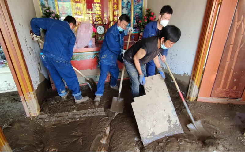 在救災(zāi)現(xiàn)場(chǎng),公司抗洪救災(zāi)突擊隊(duì)和先鋒隊(duì)員,充分發(fā)揚(yáng)“不怕苦、不怕累,敢奉獻(xiàn)、勇?lián)?dāng)”的精神,按照“8.18”山洪災(zāi)害搶險(xiǎn)救援處置工作應(yīng)急指揮部的統(tǒng)一安排,迅速投入到清除淤泥和道路清障等工作。大家不間歇地用鐵鍬清、用架子車?yán)?,兩天共清理十家住戶和三戶商鋪的屋?nèi)外淤泥,裝運(yùn)泥漿20余噸。