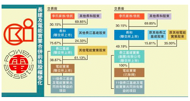 (下圖為長(zhǎng)建及電能合并前后的股權(quán)變化,圖片來自香港《文匯報(bào)》)