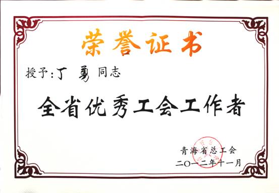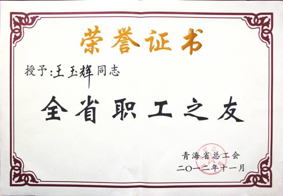 在2012年11月23日召開的青海省工會第13次代表大會上,省總工會對全省優(yōu)秀個人、模范集體進行了表彰。集團總經(jīng)理王玉輝同志榮獲"全省職工之友"榮譽稱號;青海物產(chǎn)物資配送有限責(zé)任公司工會榮獲"全省模范職工之家"榮譽稱號;馬軍同志榮獲"全省優(yōu)秀工會積極分子"榮譽稱號;丁勇同志榮獲"全省優(yōu)秀工會工作者"榮譽稱號。