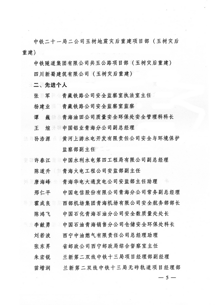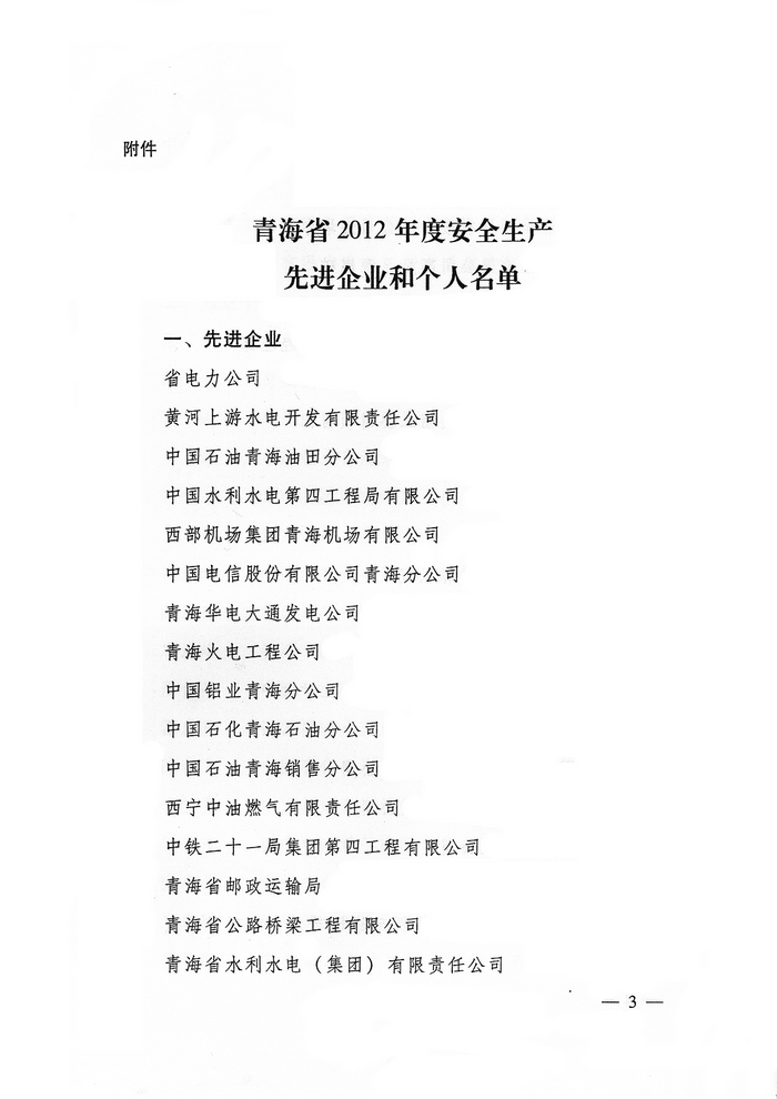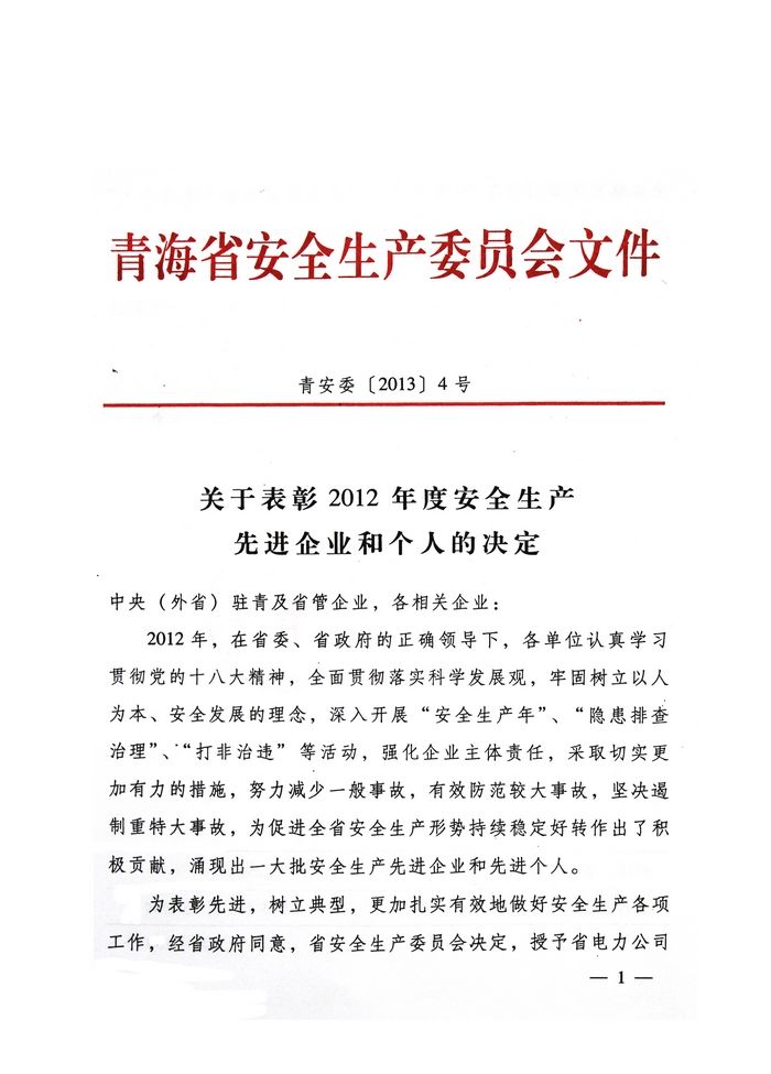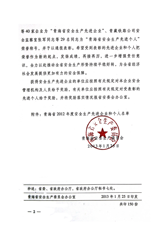 2012年,在省委、省政府的正確領(lǐng)導(dǎo)下,青海省物產(chǎn)集團(tuán)總公司認(rèn)真學(xué)習(xí)貫徹黨的十八大精神,全面貫徹落實(shí)科學(xué)發(fā)展觀,牢固樹立以人為本、安全發(fā)展的理念,深入開展"安全生產(chǎn)年"、"隱患排查治理"、"打非治違"等活動(dòng),為促進(jìn)全省安全生產(chǎn)形勢持續(xù)穩(wěn)定好轉(zhuǎn)做出了積極貢獻(xiàn)。為此,經(jīng)省政府同意,省安全生產(chǎn)委員會決定授予青海省物產(chǎn)集團(tuán)總公司"2012年度安全生產(chǎn)先進(jìn)企業(yè)"榮譽(yù)稱號。
